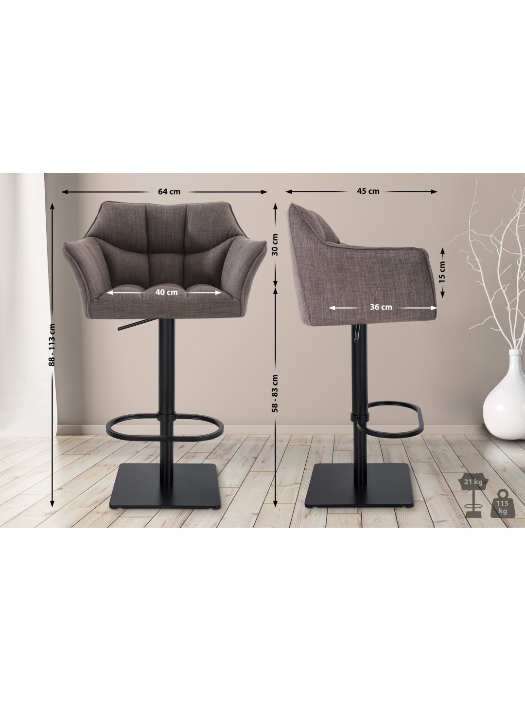 O encosto e os apoios de braços proporcionam conforto adicional ao sentar e uma postura relaxada. O banco de bar é infinitamente ajustável em altura, de modo que a altura do assento pode ser ajustada entre 58 e 83 cm. O recurso de rotação de 360 graus permite movimentos sem esforço. Graças ao apoio para os pés integrado, as pernas podem ser aliviadas.