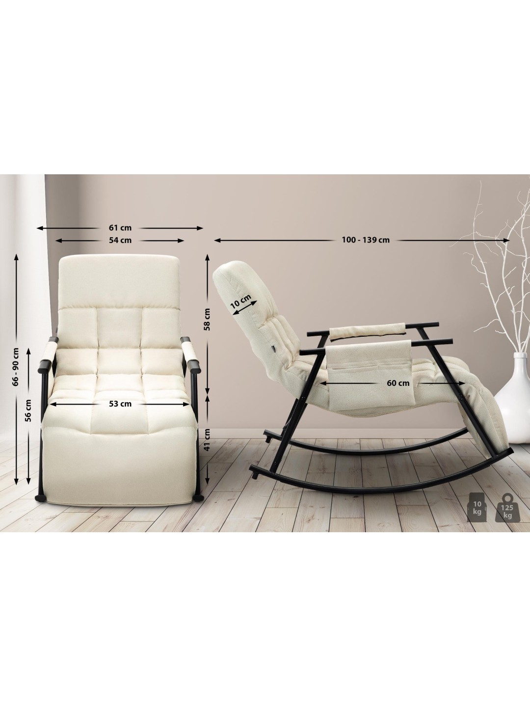 O estofamento com um padrão acolchoado moderno está disponível com capa de tecido ou veludo. A estrutura em metal com revestimento em pó contribui para o visual moderno, mas também para a alta estabilidade. A cadeira de balanço pode ser carregada com segurança com até 125 kg.