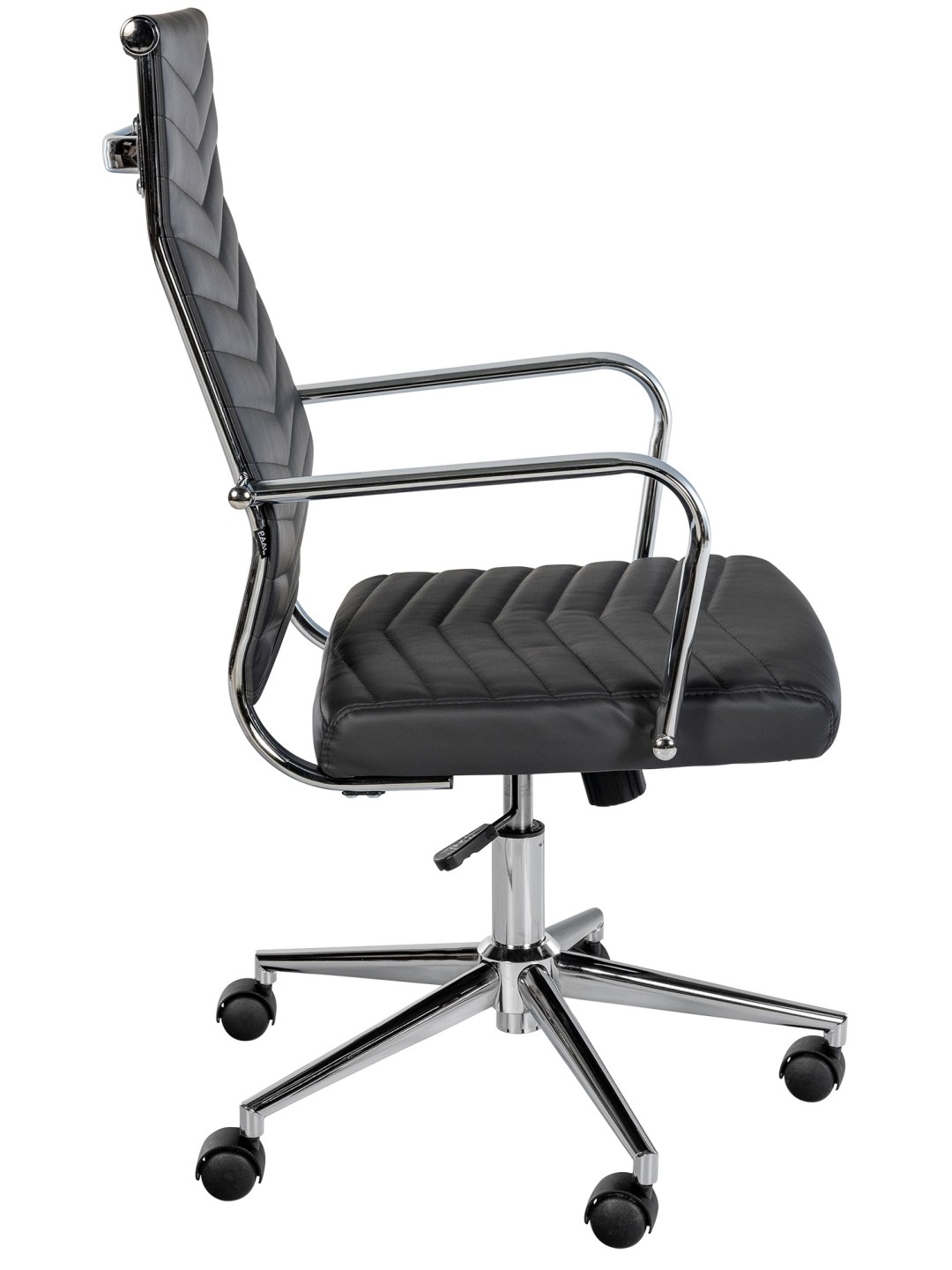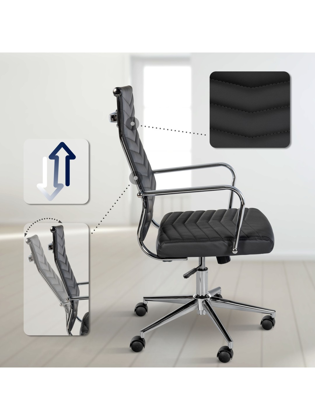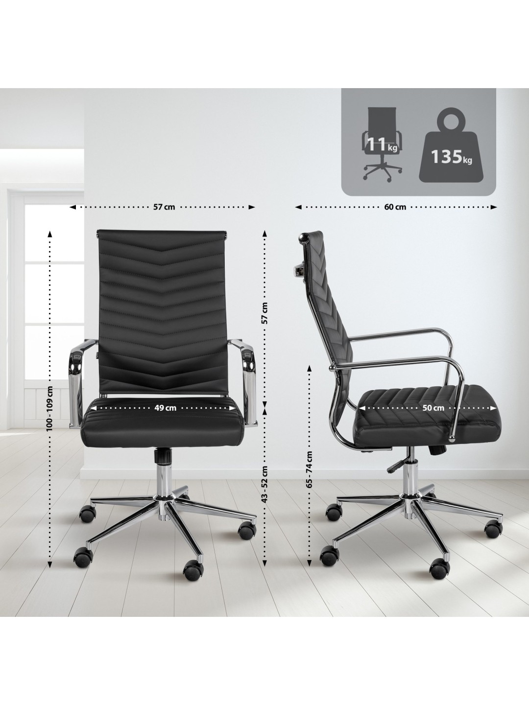 A cadeira giratória é infinitamente ajustável em altura usando o elevador a gás. Finalmente, a estrutura extremamente robusta com rodízios de deslizamento suave confere à cadeira giratória um suporte estável. A capacidade máxima de carga é de 135 kg.