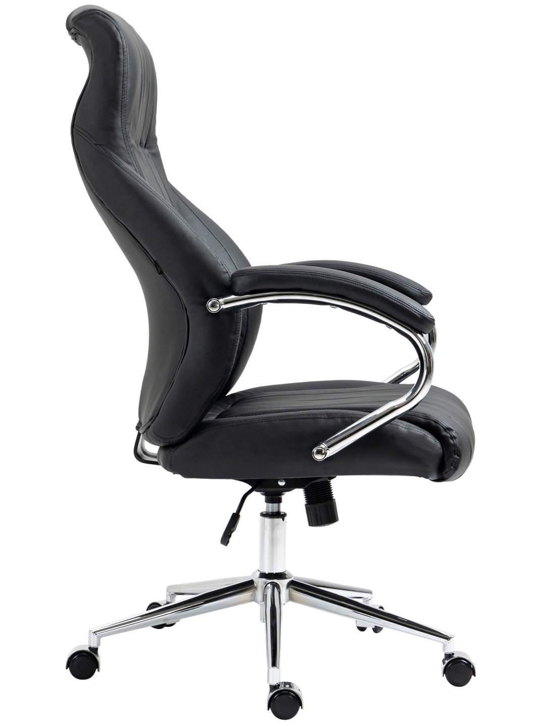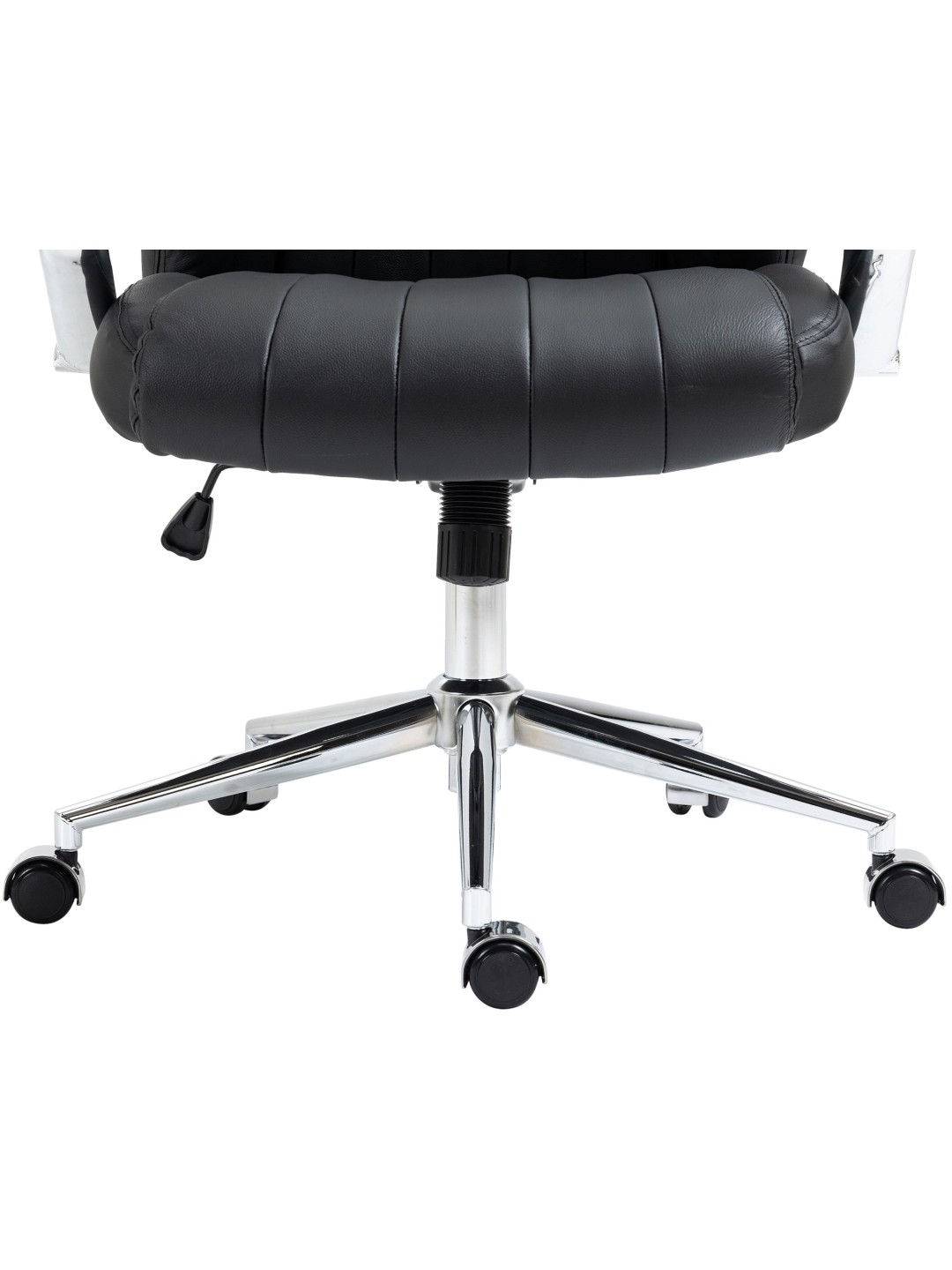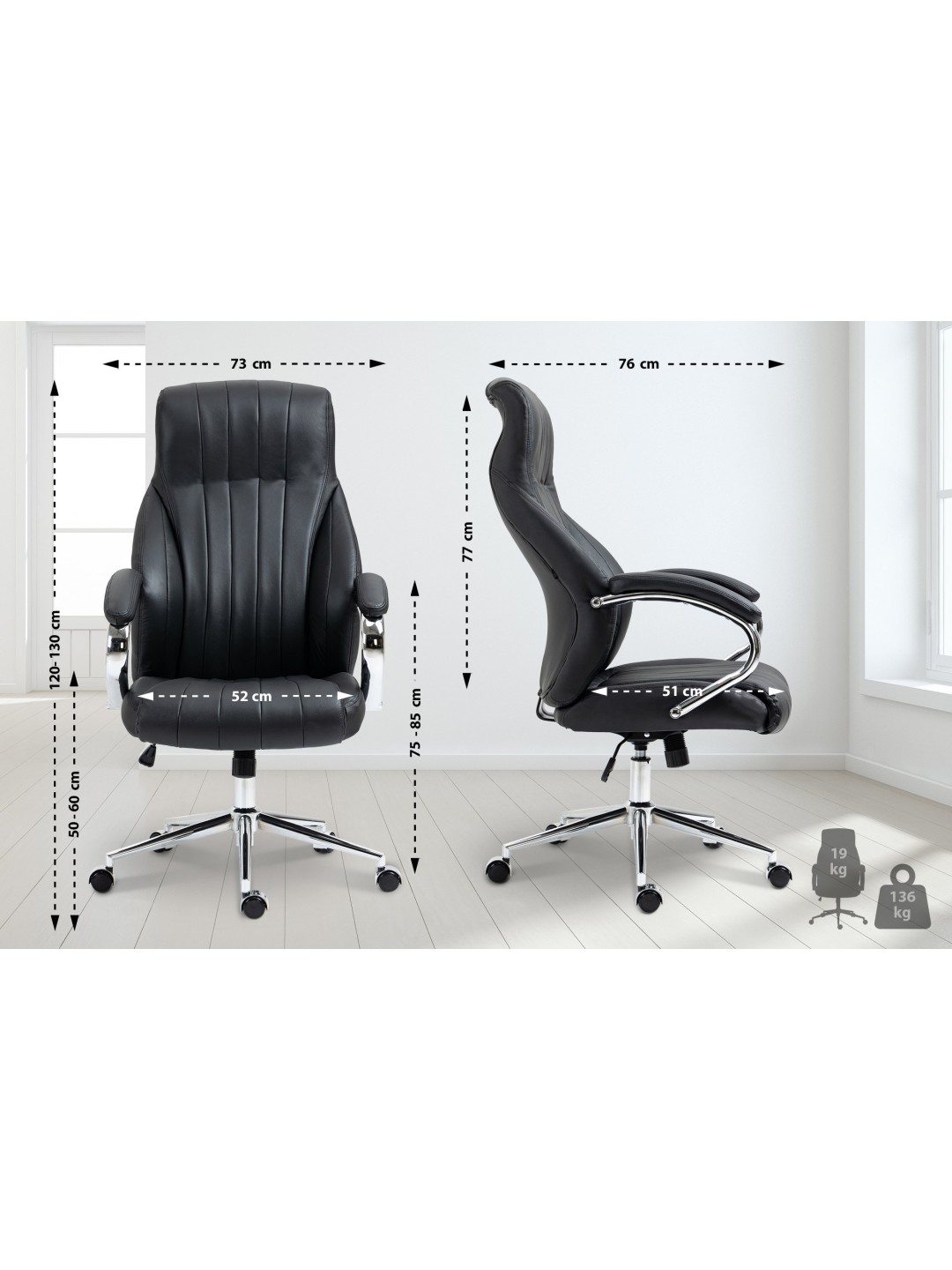 Esta cadeira de escritório exclusiva não só impressiona pelo seu visual moderno, mas ninguém pode superá-la quando se trata de conforto. Seu acolchoamento de alta qualidade garante uma experiência confortável de sentar por várias horas. Couro bovino de alta qualidade foi usado para cobrir o assento e o encosto. O encosto tem um agradável formato em S e a altura do assento é infinitamente ajustável e garante um assento ergonômico. Além disso, a cadeira está equipada com um mecanismo de balanço que garante maior liberdade de movimentos. A estabilidade é garantida pela estrutura metálica de aspecto cromado. Os cinco rodízios de deslizamento suave significam que você pode rolar facilmente e livremente pelo chão - seja em pisos duros ou em carpete.
