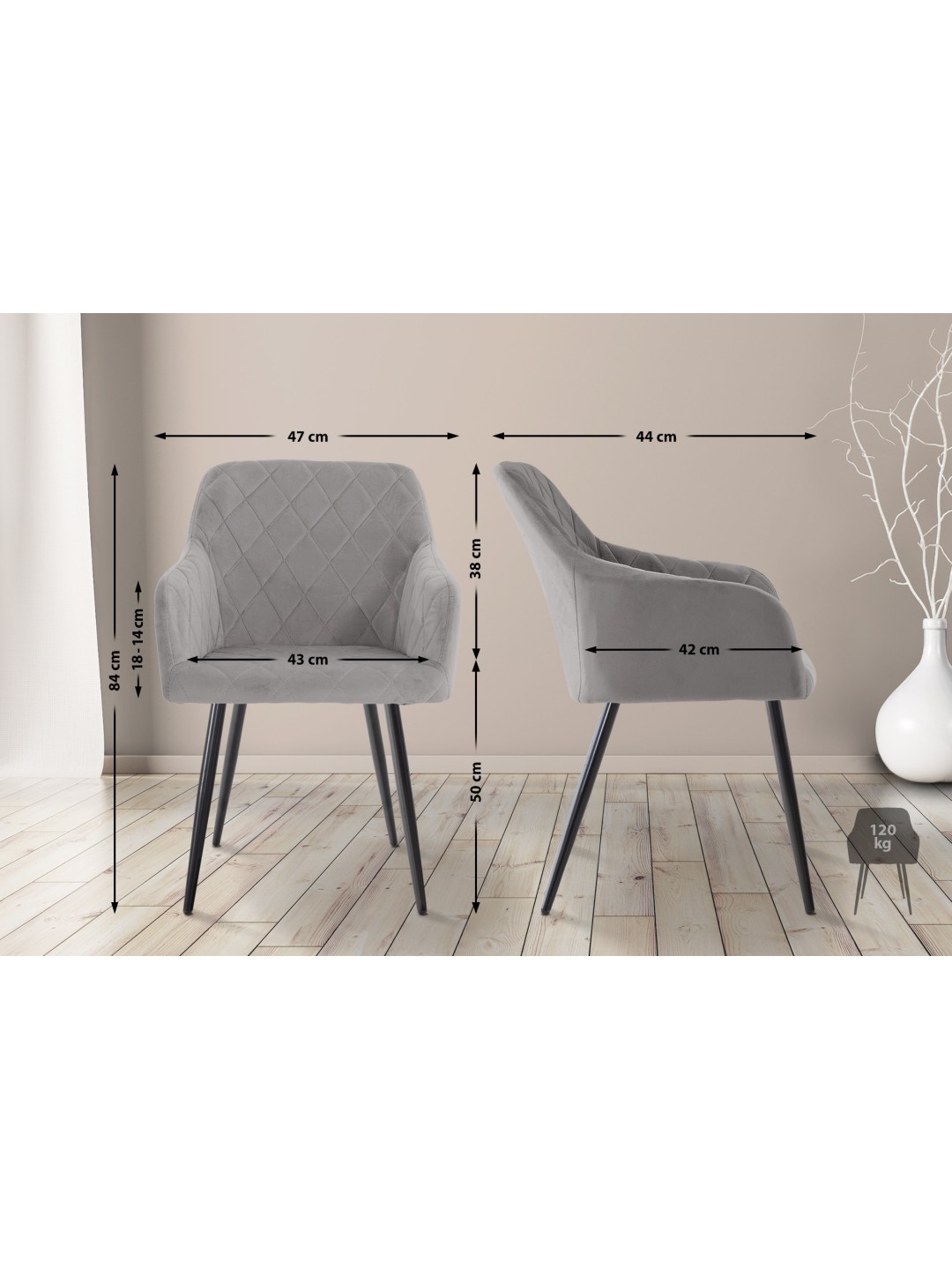 A cadeira de sala de jantar Shila é uma opção de assento confortável e elegante para o uso diário. A cadeira tem um assento generosamente acolchoado e, portanto, permite sentar-se confortavelmente mesmo durante um longo período de tempo. O conforto do assento é complementado pelo encosto e pelos apoios de braços. A estrutura metálica de quatro pernas promete estabilidade e posição segura. Esta cadeira de jantar dá um toque moderno e complementa maravilhosamente qualquer ambiente de vida. Existem também protetores de piso sob os pés para evitar arranhões no chão. A cadeira de jantar está disponível com capa de veludo ou tecido.