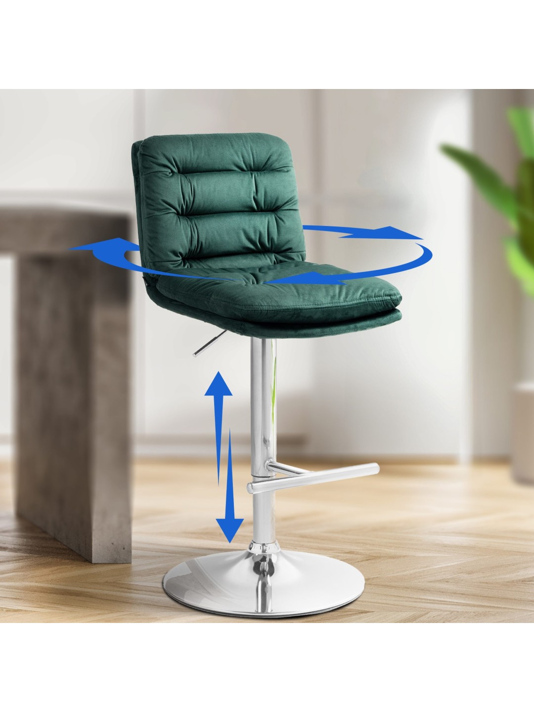 A estrutura do banco e a capa moderna dão ao banco uma aparência elegante. O assento é revestido de veludo elegante. A estrutura metálica é ajustável em altura e a função de rotação de 360 graus garante muita liberdade de movimento.