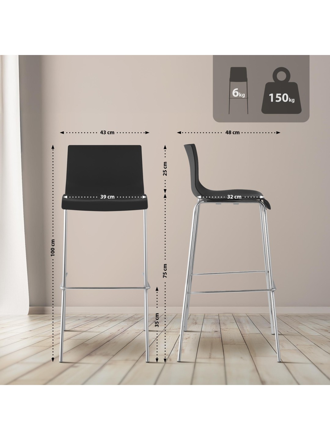Conjunto de 2 bancos altos de plástico Hoover com estrutura cromada de 4 pés, preto