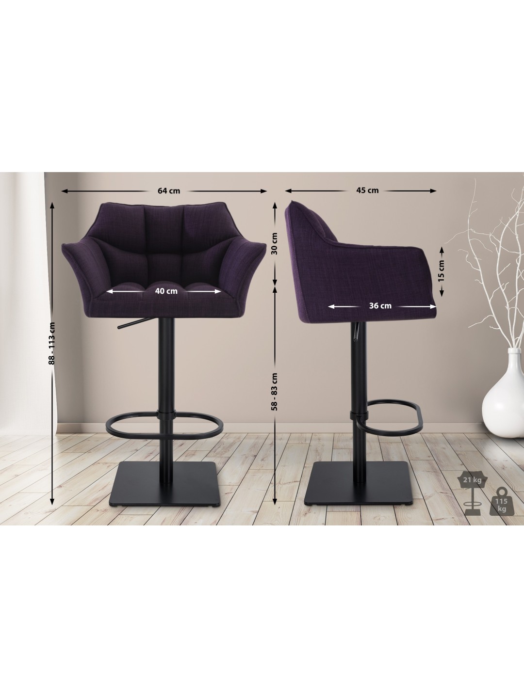 Os encostos e apoios de braços proporcionam conforto adicional ao sentar e uma postura relaxada. As cadeiras de bar são infinitamente ajustáveis em altura, de modo que a altura do assento pode ser ajustada entre 58 e 83 cm. O recurso de rotação de 360 graus permite movimentos sem esforço. Graças aos apoios para os pés integrados, as pernas podem ser aliviadas.